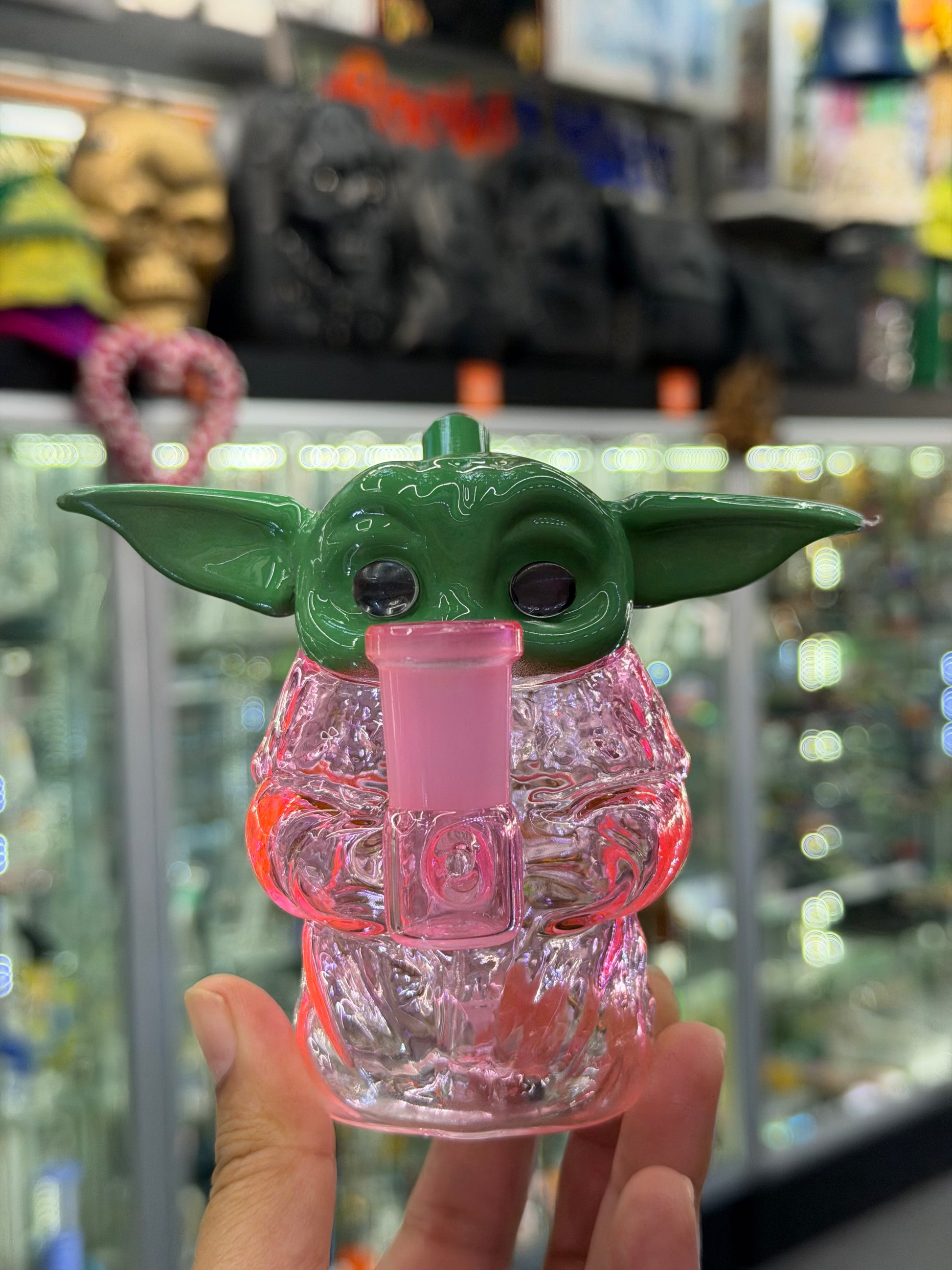 Cute meets function with this Grogu-inspired glass mini rig. Designed with a detailed green head and clear glass body,